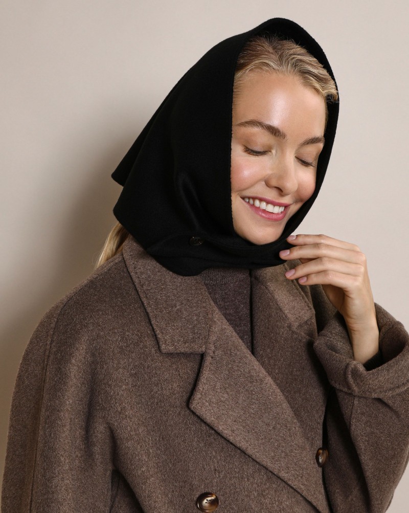 Косынка из шерсти и кашемира, выполненная из двухслойной ткани — мягкой, тонкой и приятной на ощупь, без подкладки. Застежка на пуговицы позволяет использовать косынку как головной убор или как шарф.