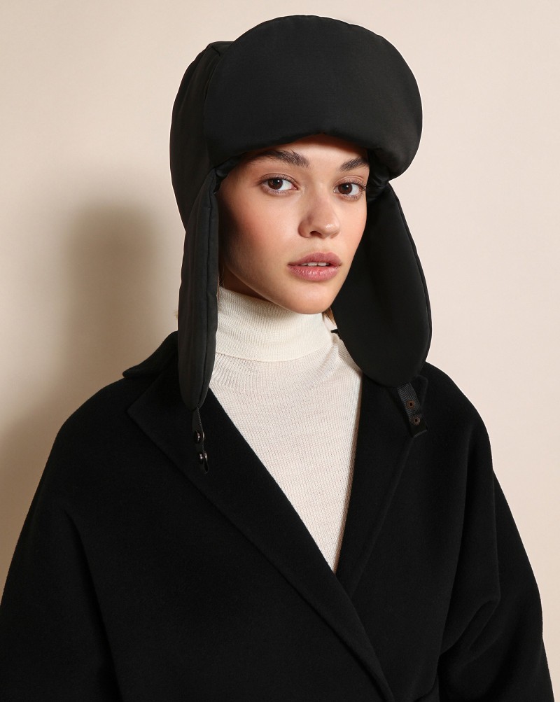 Шапка-ушанка. Удлиненная сзади, с широкими боковинами и утяжкой на затылке. Застежка на кнопки, есть декоративные шнурки. Шапка сделана из матовой плащевой ткани, приятной на ощупь. Внутри двухслойный наполнитель Siberia100, легкий, теплый и прочный. Подкладка из мягкой шелковистой ткани. Модель подойдет к образам с пуховиками и куртками, рубашечным пальто. Температурный режим до - 10 градусов Цельсия. Сделано в России.