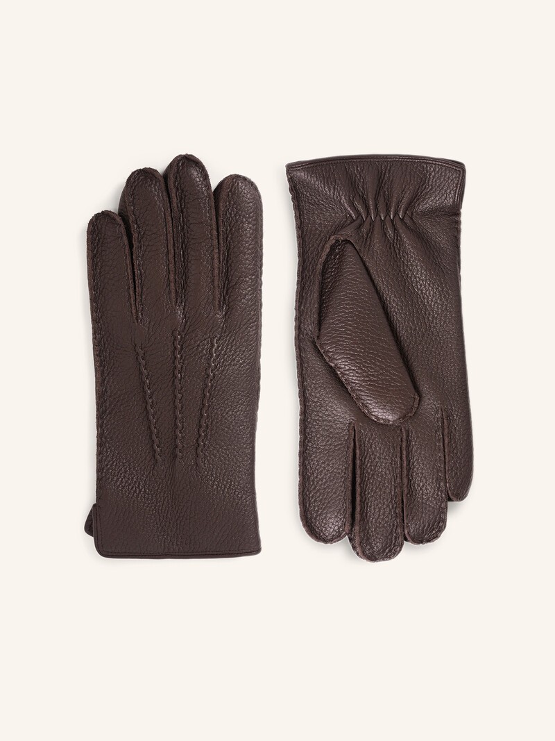 Теплые перчатки — согреют руки в прохладные дни и не займут много места в карманах. Мы сшили их из пластичной и прочной кожи оленя, добавив подкладку из нежного кашемира, а на запястье — резинку для лучшей посадки.