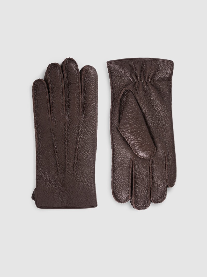 Теплые перчатки — согреют руки в прохладные дни и не займут много места в карманах. Мы сшили их из пластичной и прочной кожи оленя, добавив подкладку из нежного кашемира, а на запястье — резинку для лучшей посадки. Сделано в Китае.