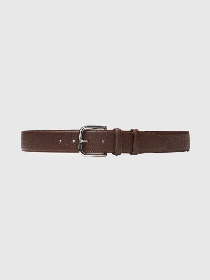Универсальный ремень с брендированной металлической пряжкой подойдет к любым джинсам. Выполнен из плотной и мягкой разбитой коровьей кожи и дополнен светлой подкладкой, которая не окрасит одежду. В этом сезоне на внутренней стороне мы добавили тиснение с артикулом и размером. Ширина 4 см. Сделано в Китае.