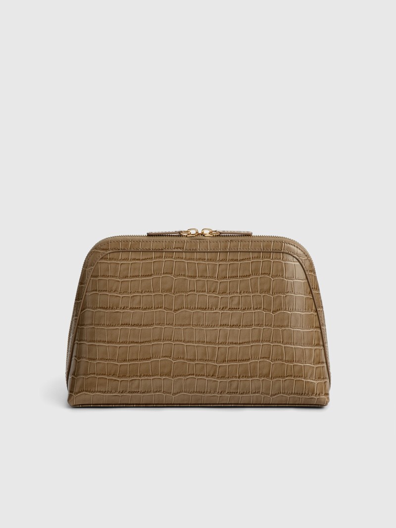 Вместительная косметичка из натуральной телячьей кожи c фактурным тиснением под крокодила. Благодаря прочности и мягкости материала и приятной текстильной подкладке с кармашком ее можно использовать как клатч. Клапаны по бокам не позволят содержимому выпасть, а плотное дно помогает косметичке стоять на поверхности. Застегивается на двухзамковую металлическую молнию, на пуллере — логотип 12 STOREEZ. Пыльник в комплекте. Сделано в Китае.