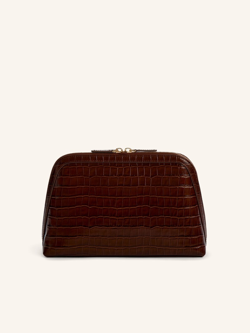 Вместительная косметичка из натуральной телячьей кожи c фактурным тиснением под крокодила. Благодаря прочности и мягкости материала и приятной текстильной подкладке с кармашком ее можно использовать как клатч. Клапаны по бокам не позволят содержимому выпасть, а плотное дно помогает косметичке стоять на поверхности. Застегивается на двухзамковую металлическую молнию, на пуллере — логотип 12 STOREEZ. Пыльник в комплекте.