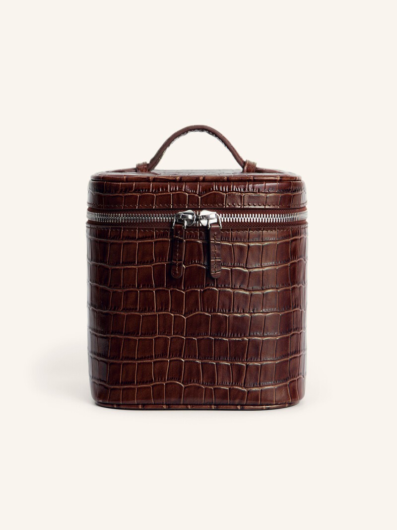Косметичка из кожи с тиснением под крокодила — универсальная и вместительная благодаря своей кубической форме. Кожаные стенки — мягкие и плотные, на молнии два удобных замка, а высота 15 см позволяет разместить внутри даже небольшие бутылочки. Текстильная подкладка дополнена небольшим кармашком. Пыльник в комплекте. Вес косметички: 0,34 кг.