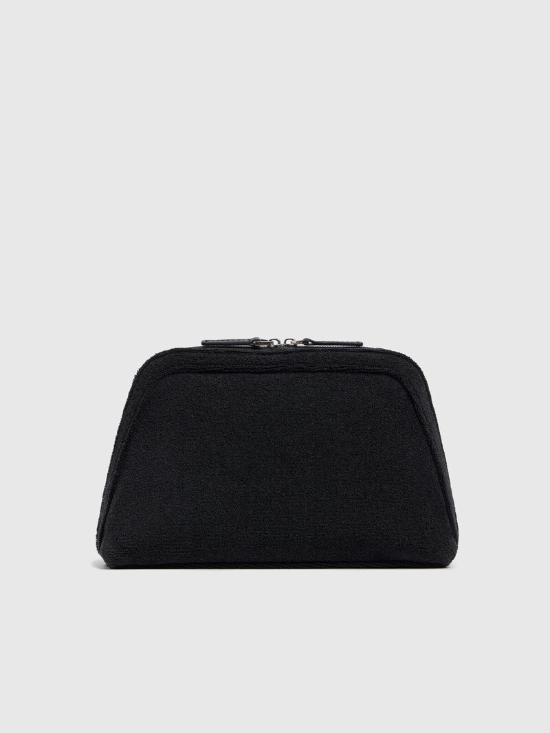 Косметичка из махровой ткани — удобная и тактильно приятная. Благодаря своей форме она довольно вместительная, а боковые вставки позволяют аксессуару сохранять устойчивость в открытом виде. Застегивается на двухзамковую молнию с пуллерами из кожи. На хлопковой подкладке. Внутри — кармашек с отделкой кожей. Сделано в Китае