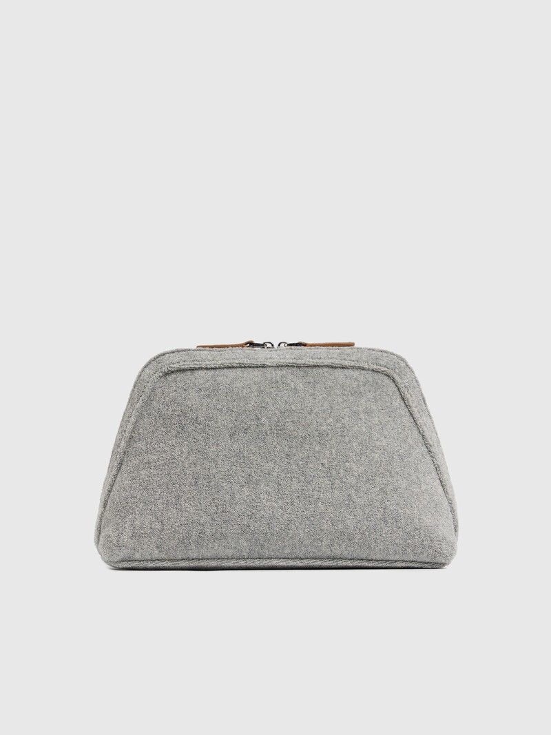 Косметичка из махровой ткани — удобная и тактильно приятная. Благодаря своей форме она довольно вместительная, а боковые вставки позволяют аксессуару сохранять устойчивость в открытом виде. Застегивается на двухзамковую молнию с пуллерами из кожи. На хлопковой подкладке. Внутри — кармашек с отделкой кожей. Сделано в Китае
