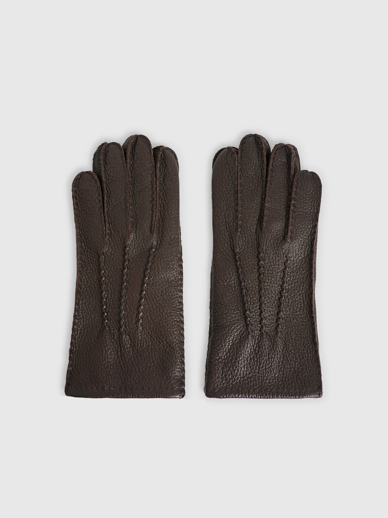 Перчатки с объемными швами и шлицей — свободно облегают руку и напоминают о дальних странах, дорогах и путешествиях. Выполнены из мягкой и толстой кожи оленя с красивой природной фактурой и мягко греют благодаря уютной подкладке из кашемира. Сделано в Китае.
