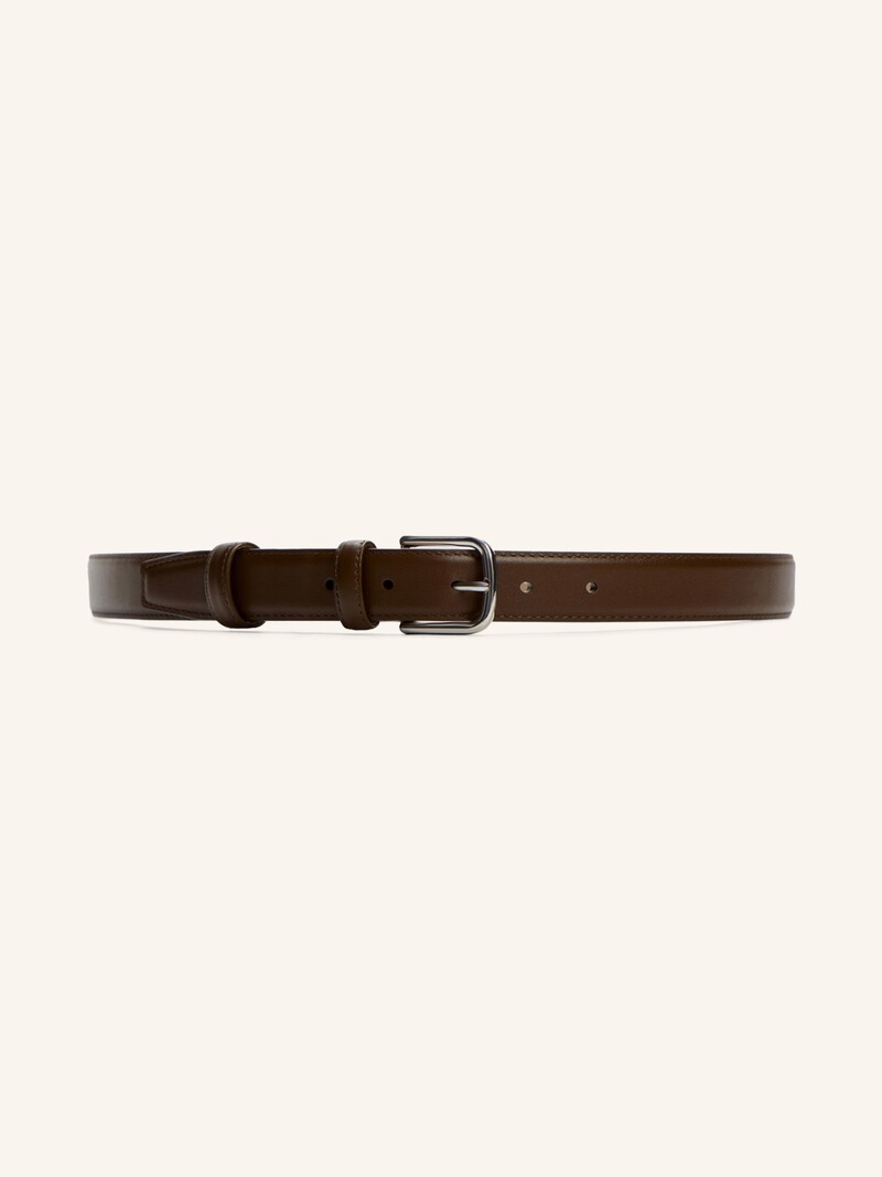 Универсальный брючный ремень из гладкой коровьей кожи, простроченный по краям. Серебристая пряжка выполнена из устойчивого к царапинам сплава, а светлая подкладка не окрасит одежду. Ремень продается в фирменной коробке. Ширина — 3 см.