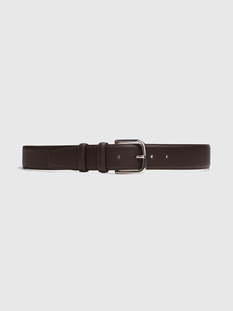 Универсальный ремень с двумя шлевками, простроченными краями и массивной пряжкой из серебристого металла. Выполнен из гладкой и прочной кожи коровы, пластичной и долговечной, и дополнен светлой подкладкой, которая не окрасит одежду. В этом сезоне на внутренней стороне мы добавили тиснение с артикулом и размером. Ширина 3,5 см. Сделано в Китае.