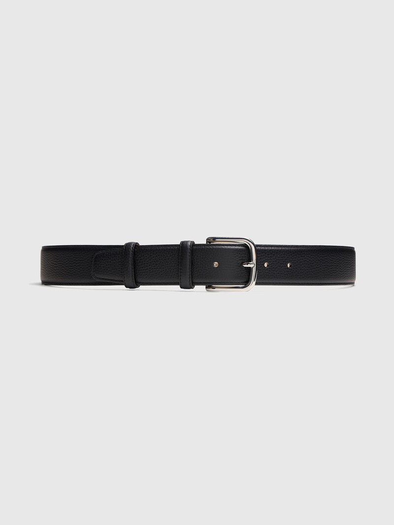 Универсальный ремень с двумя шлевками, простроченными краями и массивной пряжкой из серебристого металла. Выполнен из гладкой и прочной кожи коровы, пластичной и долговечной, и дополнен светлой подкладкой, которая не окрасит одежду. В этом сезоне на внутренней стороне мы добавили тиснение с артикулом и размером. Ширина 3,5 см. Сделано в Китае.