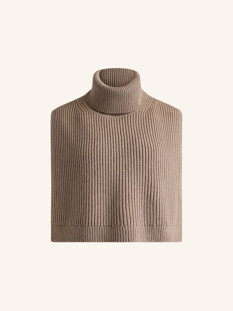 Эта теплая манишка с высоким, как у свитера, воротником поможет дольше носить любимое пальто или тренч. Она связана из шерсти мериноса и кашемира французской резинкой, а воротник — плотным рибом, который не потеряет форму со временем.