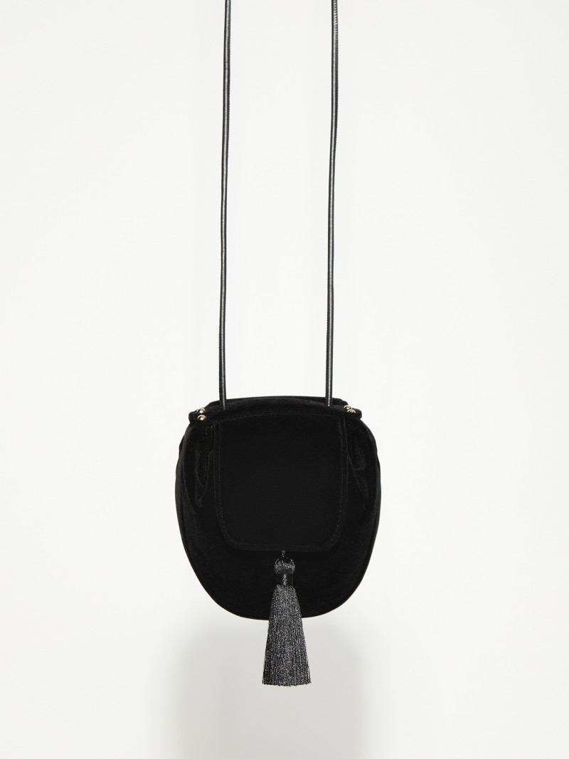Бархатная сумка для вечерних образов. Длину кожаного ремешка можно регулировать, чтобы носить сумку на плече или в руках, как клатч. Выполнена из устойчивого к истиранию бархата и дополнена кисточкой из шелка. В сумку поместятся зеркальце, помада, ключи и небольшое портмоне. - Застежка на магнитную кнопку - Внутри одно отделение, без карманов Сделано в Китае.