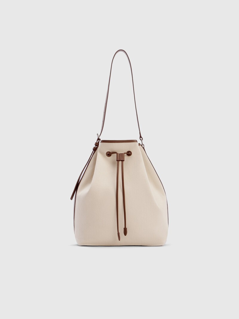 Текстильная сумка-ведро с внутренней косметичкой на молнии — универсальная и вместительная. Она может стать любимым летним аксессуаром благодаря простым линиям и сочетанию разных фактур: приятный на ощупь хлопок дополняет ремешок и отделка из натуральной кожи. Вес сумки — 0,47 кг. Сделано в Китае.