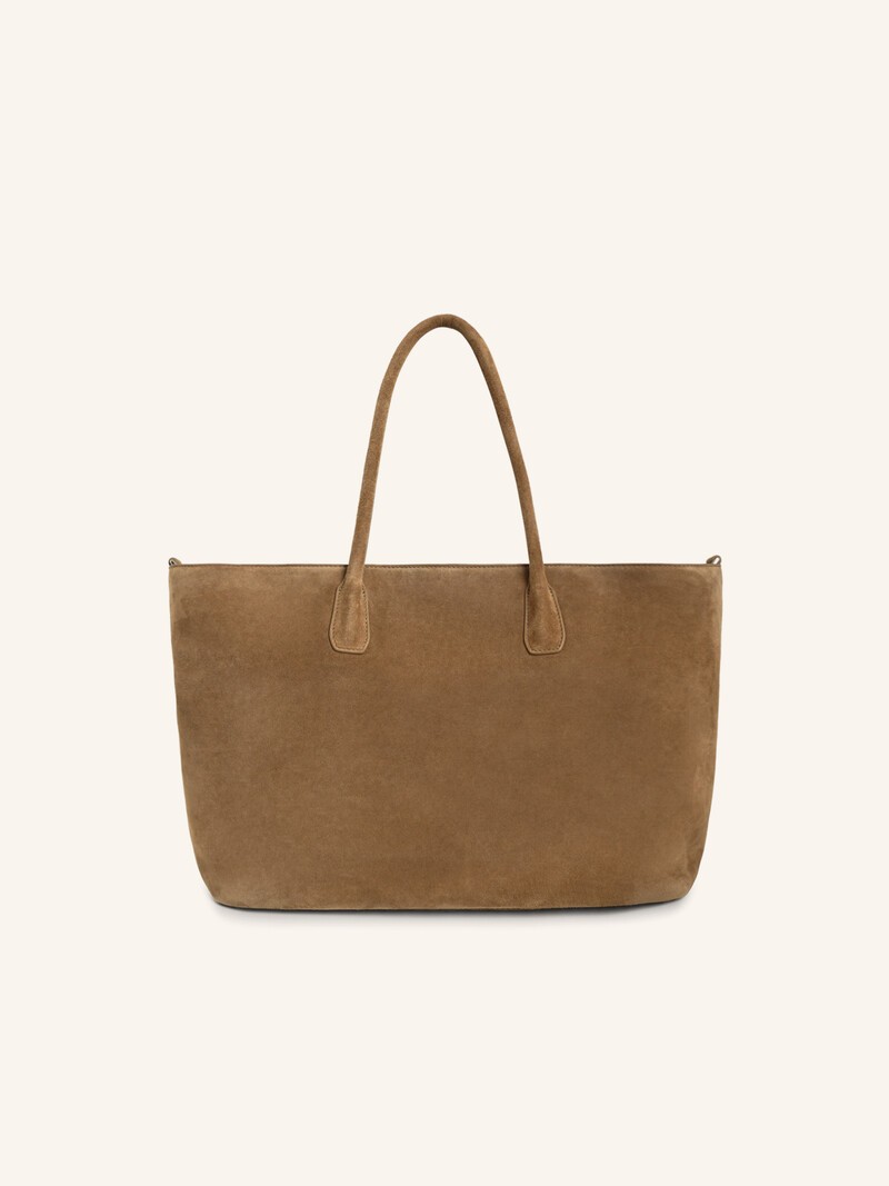Исключительная нежность — так мы описали бы тактильные ощущения от этого шопера, внутри и снаружи которого — пластичный и мягкий велюр. Для правильного хранения в сумке есть съемная косметичка на молнии, два внутренних кармашка и застежка на магнит. Натуральная замша может окрашивать светлые вещи, поэтому мы рекомендуем осторожно носить аксессуар во влажную погоду. Чтобы сделать сумку практичнее, мы выбрали для подкладки велюр бежевого цвета — это защитит содержимое от окрашивания, а ремень продублировали гладкой кожей. Вес сумки: 1,1 кг.