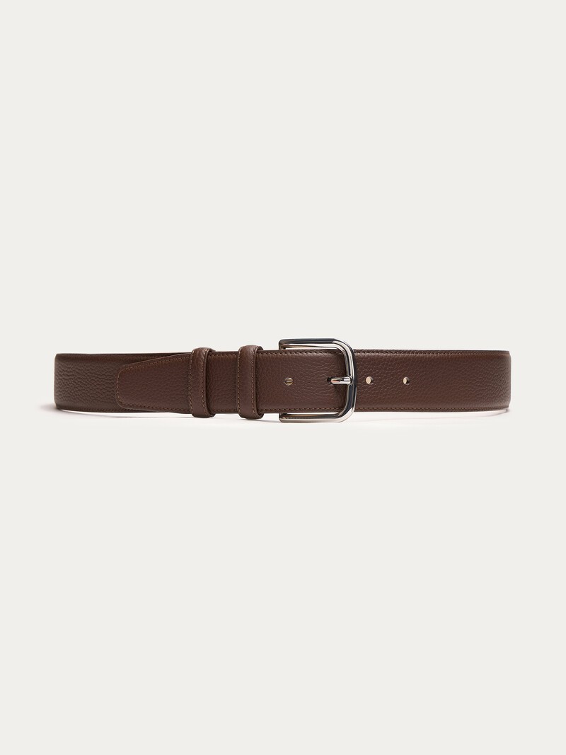 Универсальный ремень с двумя шлевками, простроченными краями и массивной пряжкой из серебристого металла. Выполнен из гладкой и прочной кожи коровы, пластичной и долговечной, и дополнен светлой подкладкой, которая не окрасит одежду. В этом сезоне на внутренней стороне мы добавили тиснение с артикулом и размером. Ширина 3,5 см. Сделано в Китае.