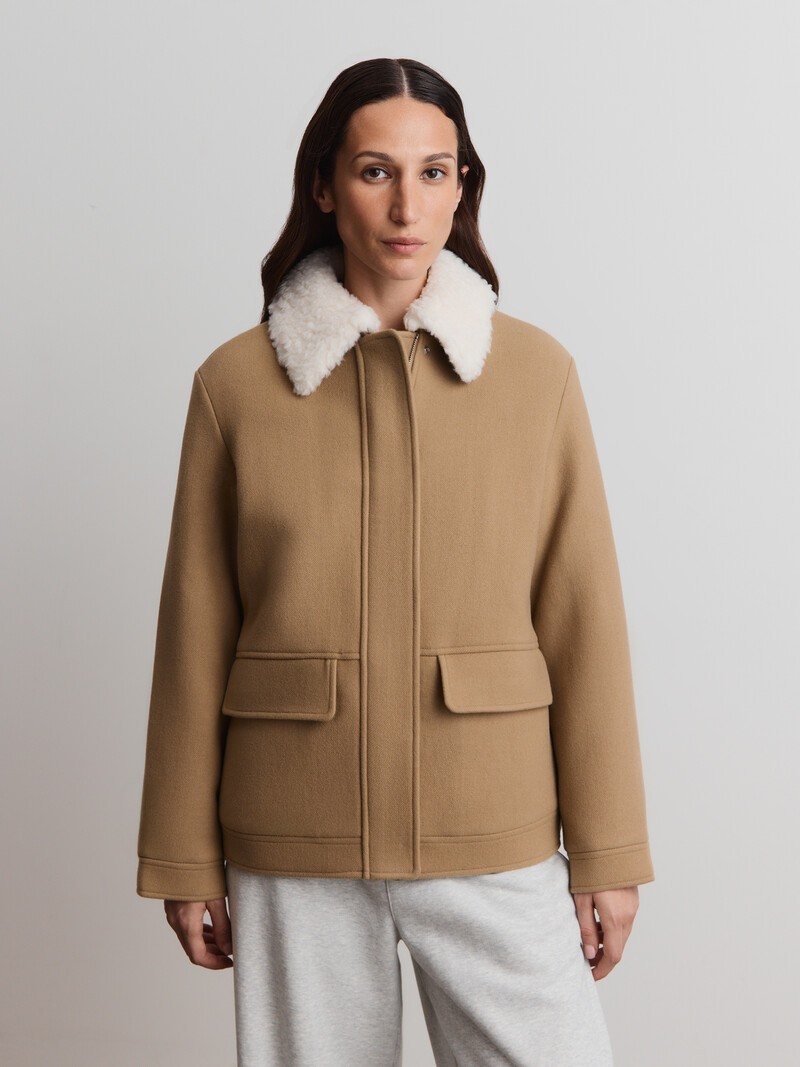 Куртка-бомбер со съемным воротником из стриженой овчины с густым курчавым мехом. Чуть спущенное плечо создает свободный, комфортный силуэт. Материал — приятный на ощупь, ворсистый и плотный твил из теплой шерсти и нежного кашемира. Объем по нижнему краю и ширина манжет регулируются с помощью кнопок. А мягкая подкладка на основе купро простегана с тонким слоем утеплителя. Застегивается на молнию. Легкий инновационный утеплитель DuPont Sorona (60 гр) из растительного сырья согревает, как настоящий пух, не становится тоньше со временем и впитывает влагу. Его производство использует на 30% меньше энергии, а выбросы парниковых газов сокращаются на 63%. Сделано в Китае.