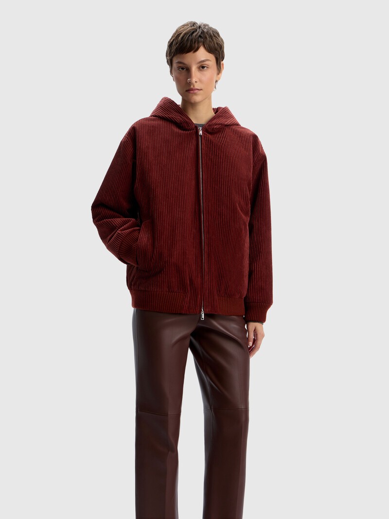 Уютный бомбер для начала сезона: объемный округлый силуэт, карманы по бокам, глубокий капюшон, манжеты из 100% шерсти. Выполнен из плотной вельветовой ткани с широким рубчиком, защищающей от капель дождя благодаря легкому WR и мембране. Подкладка из шелковистой поливискозы простегана с утеплителем. Застегивается на молнию. Легкий инновационный утеплитель DuPont Sorona (60 гр) из растительного сырья согревает, как настоящий пух, не становится тоньше со временем и впитывает влагу. Его производство использует на 30% меньше энергии, а выбросы парниковых газов сокращаются на 63%. Сделано в Китае.