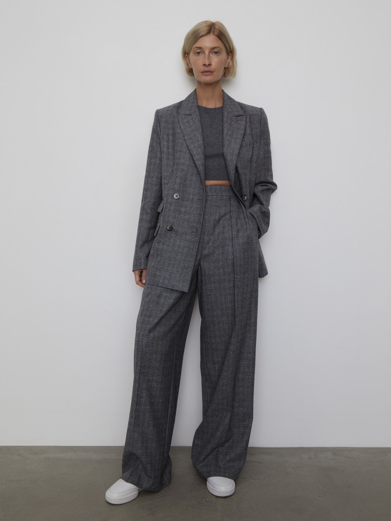 Базовые брюки с посадкой чуть ниже талии и плотным поясом — вы можете носить их и без ремня. Выполнены из итальянской костюмной шерсти, слегка ворсистой, с рисунком в неконтрастную клетку. Ткань хорошо держит форму и сохраняет тепло. Сделано в России.