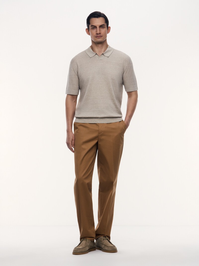 1. Универсальная модель на каждый день — слегка зауженные книзу брюки чинос со стрелками 2. Плотный гладкий хлопок из Италии — сатиновое переплетение делает ткань менее сминаемой и шелковистой на ощупь 3. Продуманные детали — петелька в области гульфика фиксирует ремень, когда брюки расстегнуты