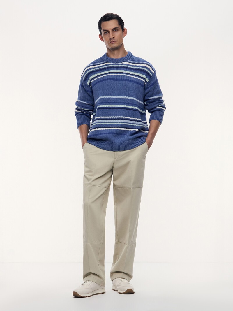 1. Ткань от нашего итальянского поставщика — мягкая и плотная смесь хлопка и шерсти 2. Приятно согревают и долго служат благодаря составу и твиловому переплетению, как у денима 3. В глубокие косые карманы удобно прятать руки, а небольшая петелька на бедре отсылает к классическим carpenter pants 4. Подходят для офиса — стрелки делают модель более собранной и универсальной