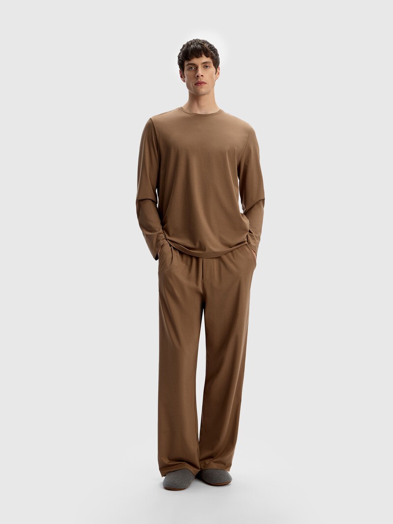 Свободные брюки с эластичным поясом, незаменимые дома и в путешествиях. Выполнены из тонкого и мягкого трикотажа на основе хлопка и модала. Струящийся материал с приятной на ощупь шелковистой фактурой отлично дышит, впитывает влагу, не растягивается и не теряет цвет. Сделано в Китае.