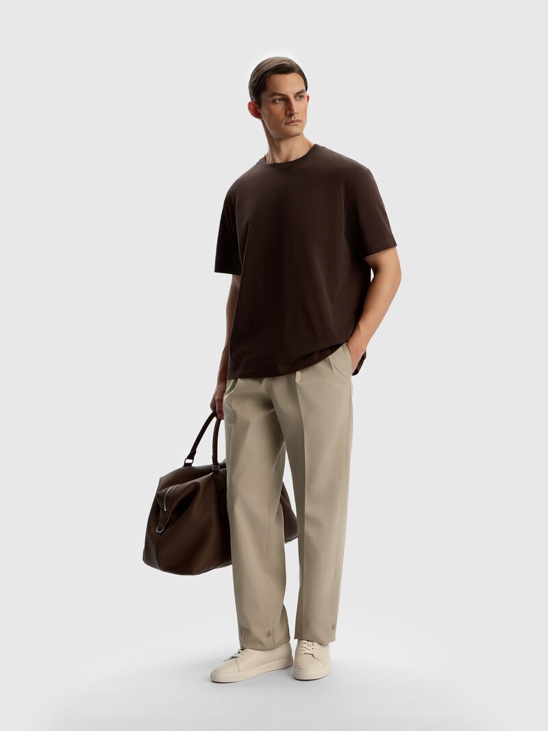 Брюки со складками, переходящими в стрелки, и боковыми карманами — для комфортных расслабленных образов. Слегка зауженный силуэт позволяет носить их не только с классической, но и с любимой спортивной обувью. Внутрь эластичного пояса добавлен шнурок для лучшей регулировки посадки — с ним можно вполне обойтись без ремня. Выполнены из 100% хлопка, произведенного в Италии: плотный и гладкий материал с сатиновым переплетением обладает деликатным блеском и мало мнется. Сделано в России.