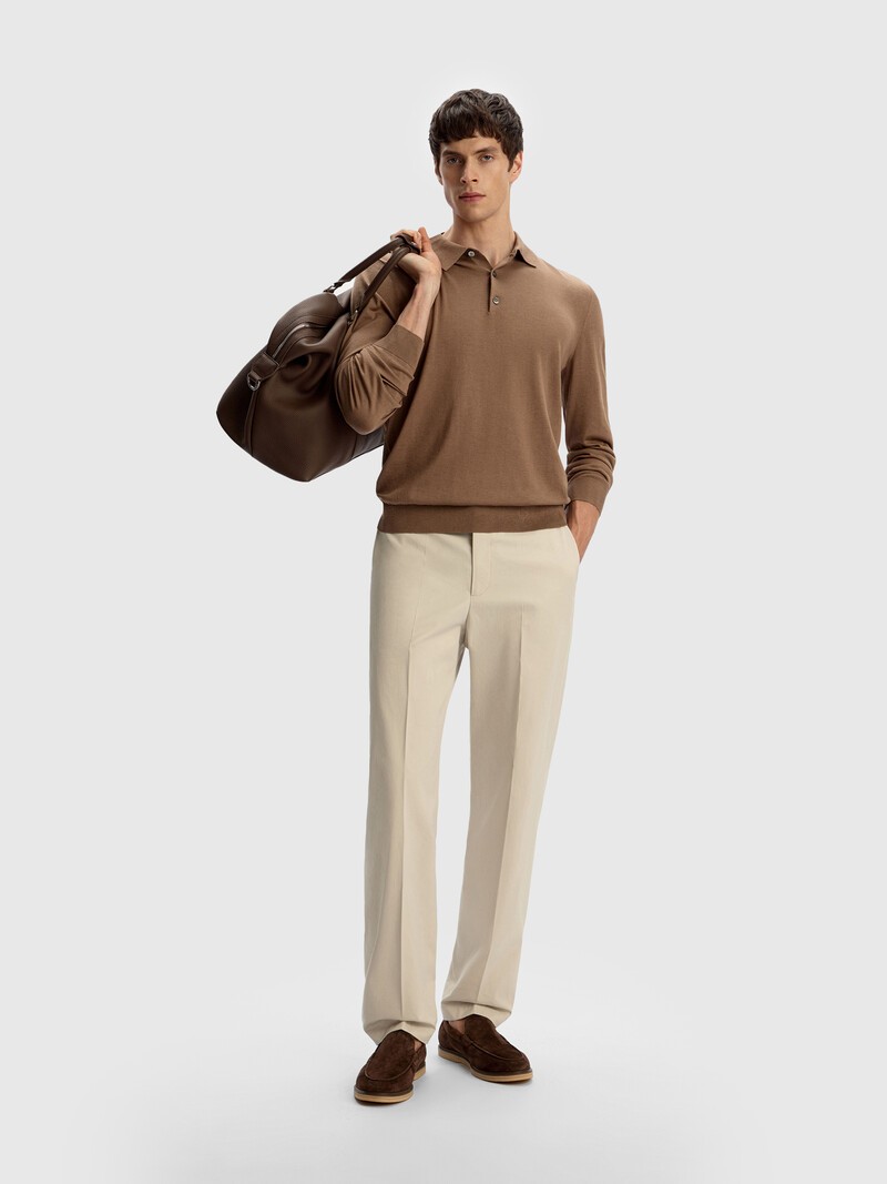 Универсальные брюки чинос, слегка зауженные книзу, со стрелками и боковыми карманами — комфортная и аккуратная модель на каждый день. В области гульфика мы добавили петельку для фиксации ремня в расстегнутом виде. Выполнены из 100% хлопка, произведенного в Италии: плотный и гладкий материал с сатиновым переплетением обладает деликатным блеском и мало мнется. Застегиваются на молнию и крючок. Сделано в России.