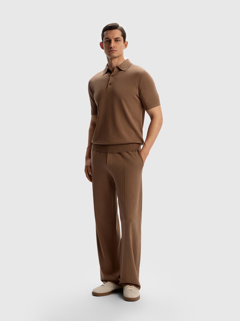 Прямые широкие брюки с застроченными стрелками и карманами — для комфортных расслабленных образов. Внутрь эластичного пояса продет шнурок для регулировки посадки, гульфик расстегивается. Брюки связаны в две нити из легкой и нежной пряжи, в составе которой хлопок и шелк. Комбинируйте с джемпером-поло или футболкой из нашей коллекции. Сделано в Китае.