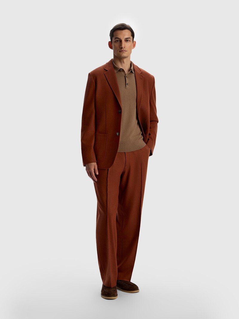 Комфортные брюки, по крою напоминающие текстильные: зауженные книзу, с защипами и простроченной стрелкой. Выполнены из плотного и согревающего шерстяного трикотажа с переплетением интерлок, который хорошо держит форму и не деформируется со временем, и подшиты потайной строчкой, чтобы вам было удобнее отрегулировать длину. На частичной подкладке. Застегиваются на молнию и крючок. Комбинируйте с пиджаком из нашей коллекции. Сделано в Китае.