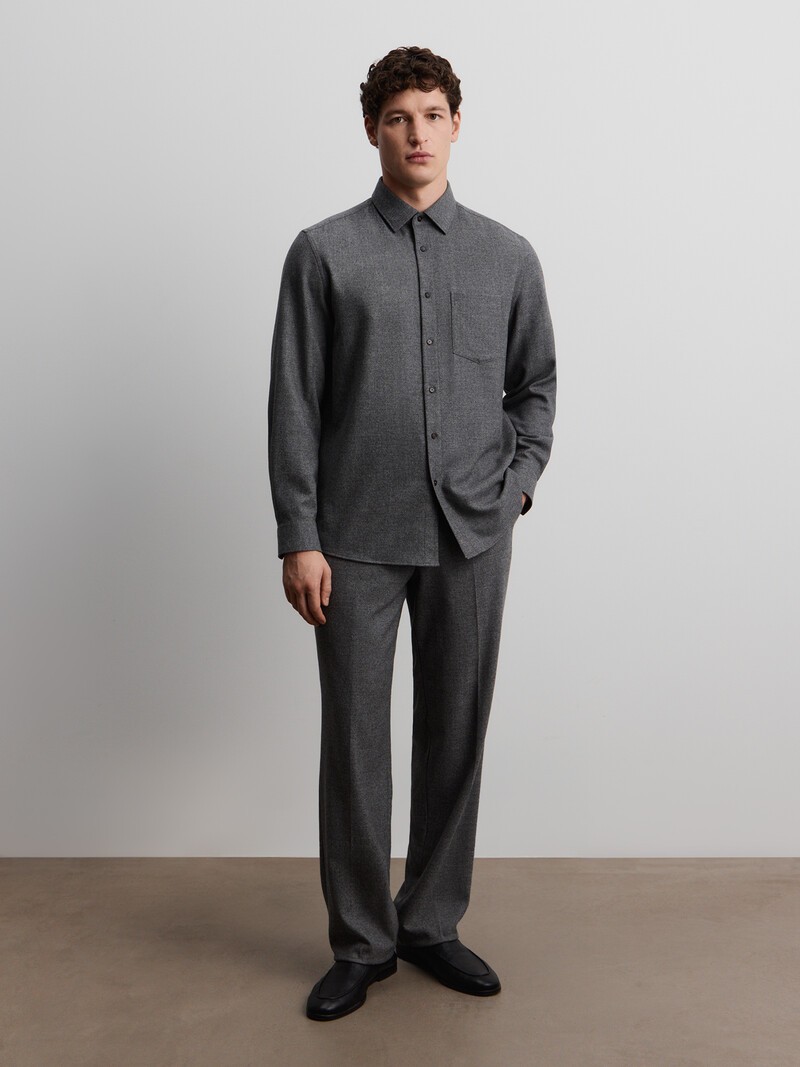Эти комфортные брюки сшиты из мягкой теплой фланели от итальянской фабрики Drago — благодаря инновационный обработке тонкая шерсть отталкивает пыль и влагу, помогая вам сохранять безупречный вид в течение дня. Эластичный пояс полностью расстегивается, швы с изнанки аккуратно закрыты кантом, а заутюженные стрелки позволяют выбирать эти брюки для самых разных поводов.