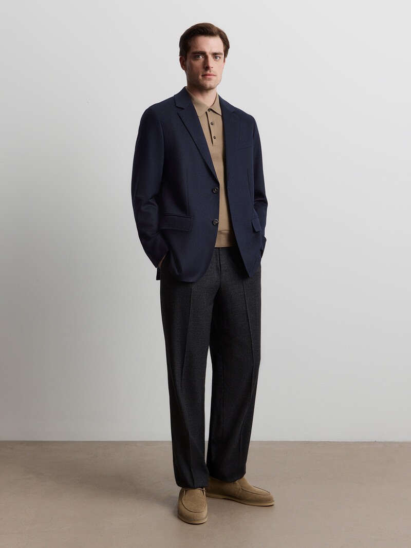 Эти комфортные брюки сшиты из мягкой теплой фланели от итальянской фабрики Drago — благодаря инновационный обработке тонкая шерсть отталкивает пыль и влагу, помогая вам сохранять безупречный вид в течение дня. Эластичный пояс полностью расстегивается, швы с изнанки аккуратно закрыты кантом, а заутюженные стрелки позволяют выбирать эти брюки для самых разных поводов.