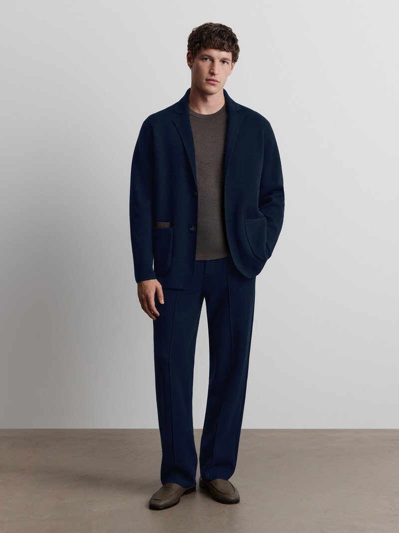 Вязаные брюки с отстроченными стрелками и карманами — для прохладных дней. В этом сезоне мы сделали шнурок с кожаными наконечниками и закрепили его в поясе, чтобы он не переворачивался и не смещался. Плотный и дышащий трикотаж с двойным переплетением хорошо держит форму и напоминает костюмную шерсть. Сделано в Китае.