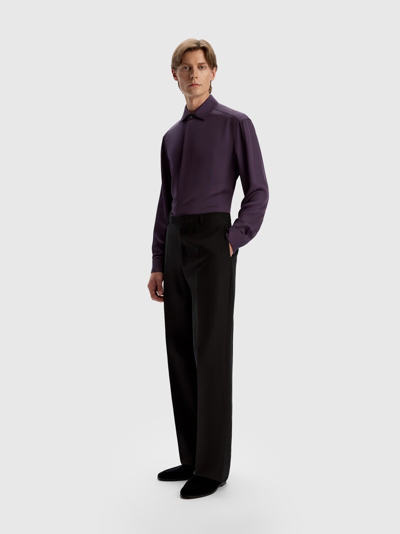 Зауженные лаконичные брюки со стрелками — для торжества или дней, когда вам захочется добавить в свой образ особый акцент. Выполнены из тонкой костюмной шерсти с шелком. Пластичная легкая ткань с приглушенным естественным блеском и натуральным составом комфортна в любой сезон, но мы дополнили брюки частичной подкладкой — уютной и тактильно приятной. Чтобы вы могли отрегулировать длину брючин точно по росту, мы оставляем их неподшитыми и дополняем специальной тесьмой.