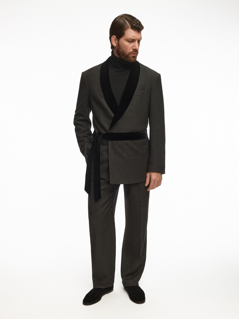 1. Семейная фабрика Drago в Пьемонте производит костюмные ткани на основе шерсти с 1973 и работает с Brioni, Kiton, Hugo Boss и Ermenegildo Zegna 2. Тонкая шерсть мериноса отталкивает влагу и грязь на уровне волокон — капли пролитого напитка легко стереть салфеткой 3. Легко добиться идеальной посадки — ширина пояса регулируется с помощью хлястиков по бокам 4. Чтобы брюки скользили по ноге и не вытягивались, мы делаем подкладку до колена 5. Нижний край намеренно не подшит. К брюкам прилагается мешочек с тесьмой — отнесите тесьму и брюки в ателье, чтобы подогнать длину по вашему росту