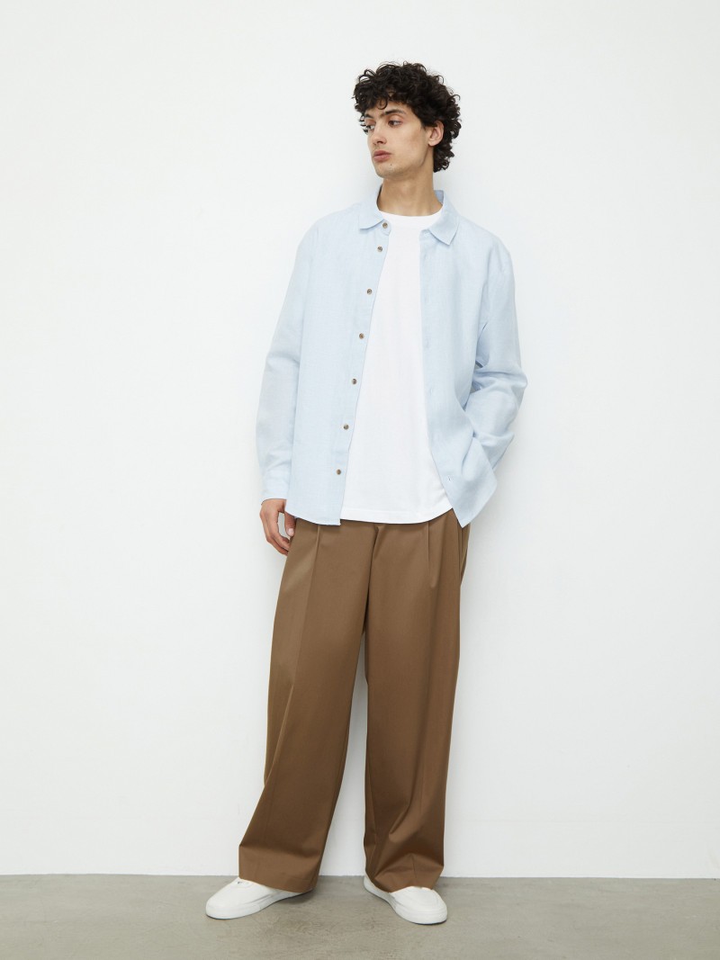 Широкие брюки со складками — альтернатива костюмным брюкам, которые летом кажутся слишком строгими. Сшиты из легкого хлопка с приятной на ощупь мягкой фактурой и дополнят образы с тонкими джемперами и футболками поло. Сделано в России.