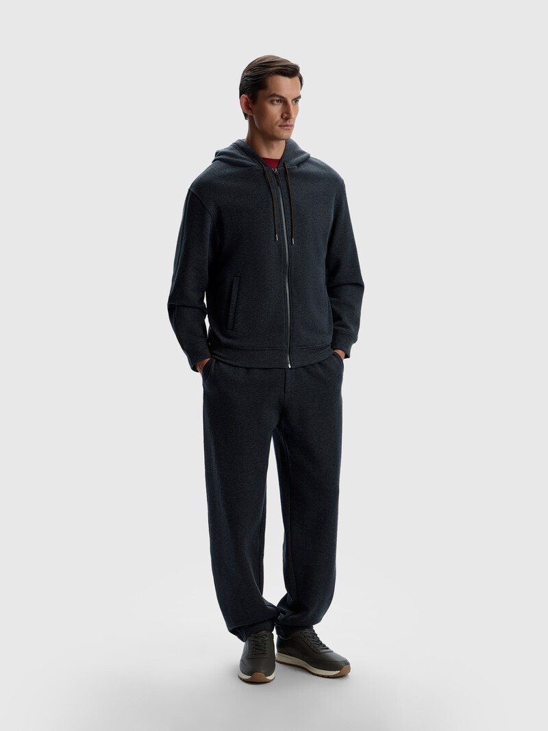 Джоггеры из мягкой ткани с начесом. Эластичный пояс не расстегивается, но гульфик мы сделали функциональным, а внутренний шнурок выполнили из натуральной замши. Материал для этих брюк имеет шелковистую лицевую фактуру и небольшой подстриженный ворс с изнанки, который хорошо удерживает тепло. Сделано в Китае.
