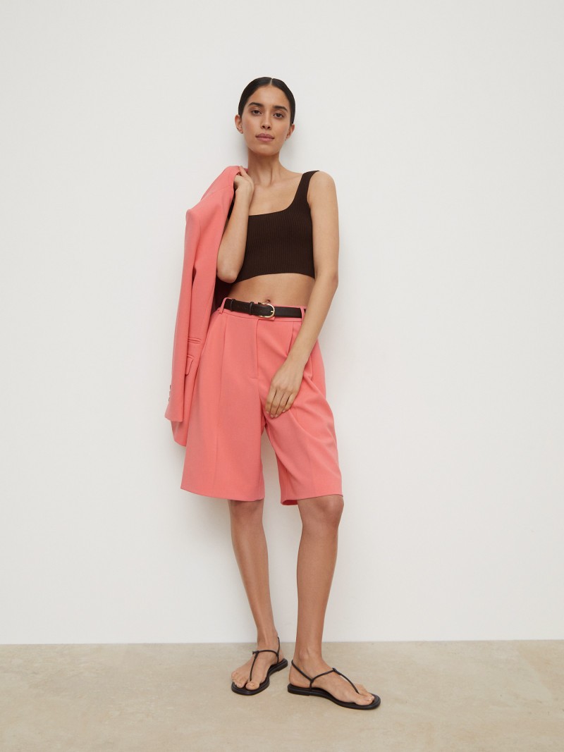 Шорты-бермуды в стиле классических брюк легко стилизовать: добавьте к ним легкий жакет или топ, составьте образ для отдыха с футболкой и спортивной обувью. Для модели выбрали матовую и гладкую костюмную ткань. Без подкладки. Застежка на молнию и крючок. Сделано в России.