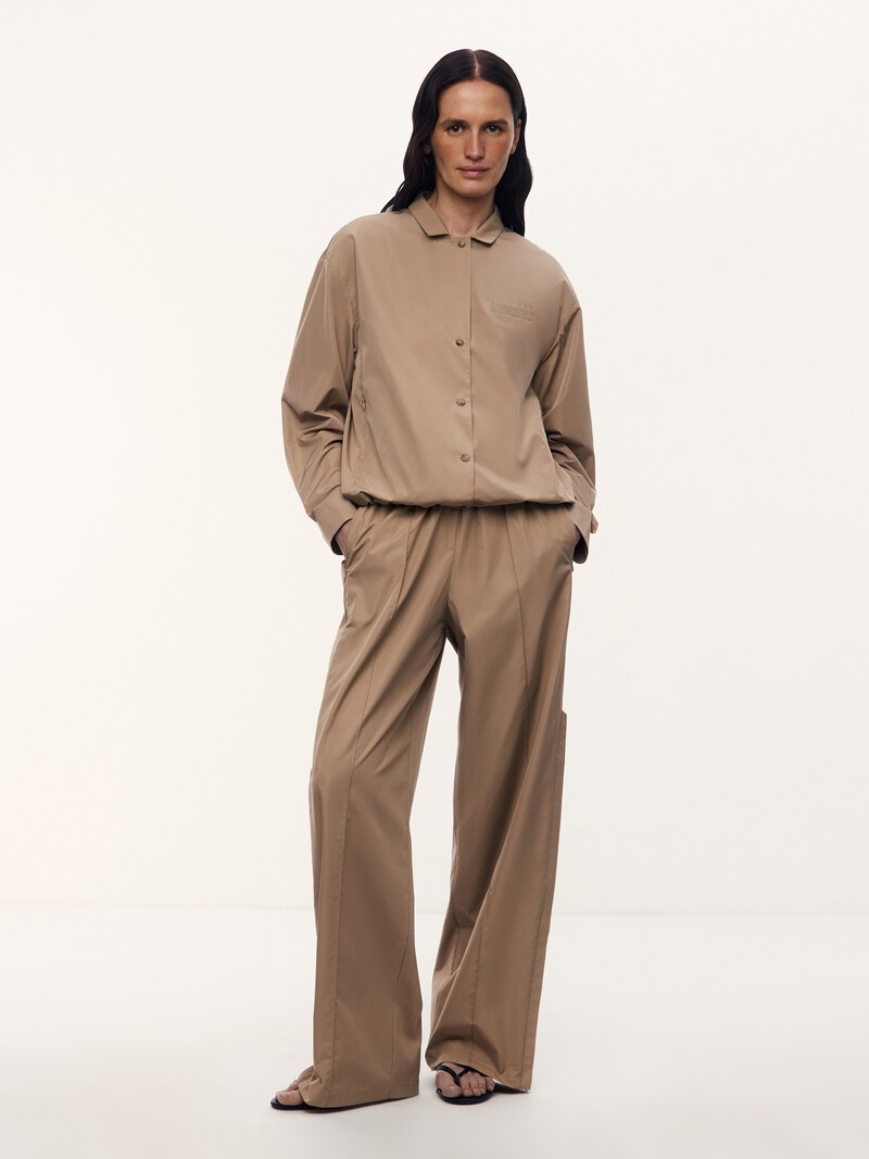 1. Материал от корейской фабрики, которая специализируется на технологичных тканях для верхней одежды. Этот гладкий и шелковистый на ощупь материал не мнется и отталкивает легкие осадки 2. Особенность модели — декоративная деталь на поясе, канты по бокам и имитация стрелок, которые визуально делают вас выше 3. С помощью потайных молний можно сделать разрезы снизу — почти до колена