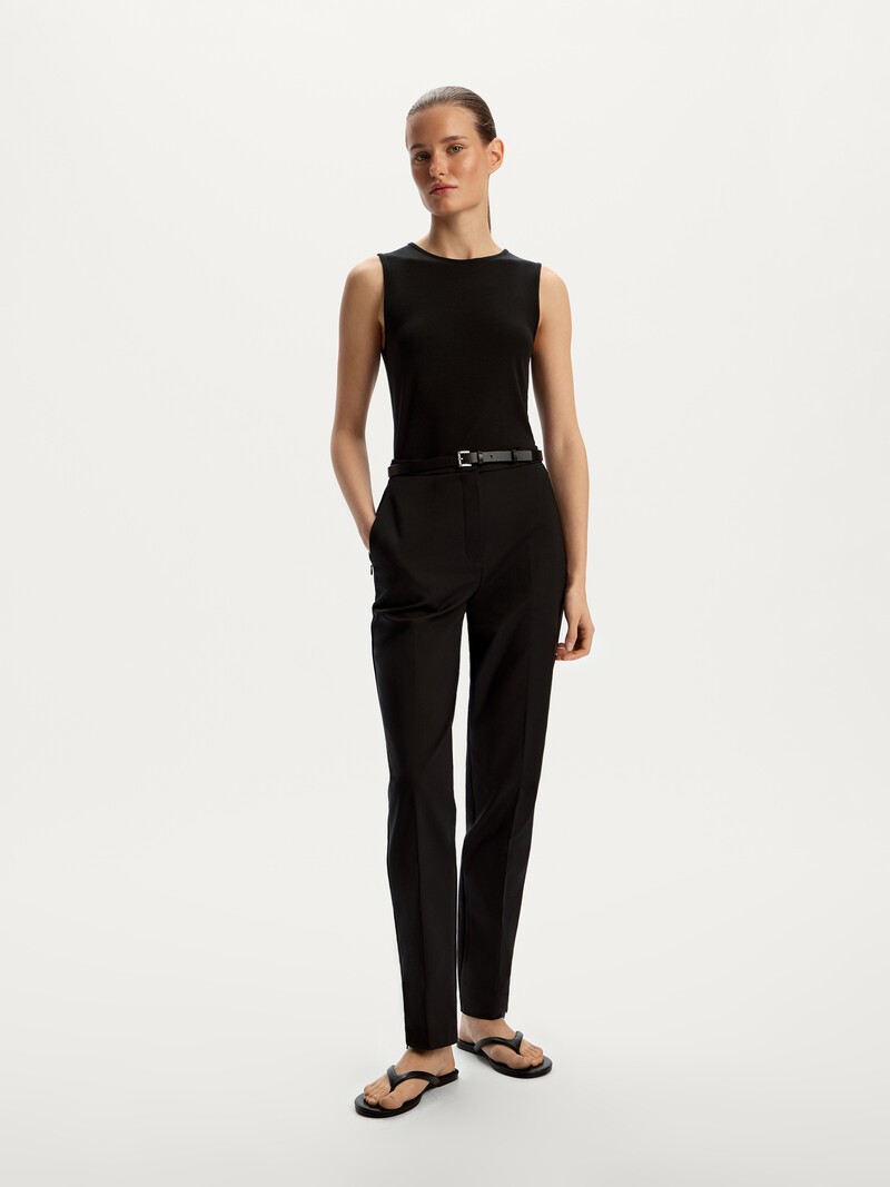Лаконичные зауженные брюки со стрелками — основа базового гардероба. Выполнены из плотной костюмной ткани на основе хлопка, дышащей и приятной к телу. Эластичный пояс обеспечивает комфортную посадку по фигуре, а ширину брючин можно отрегулировать. Сделано в Китае.