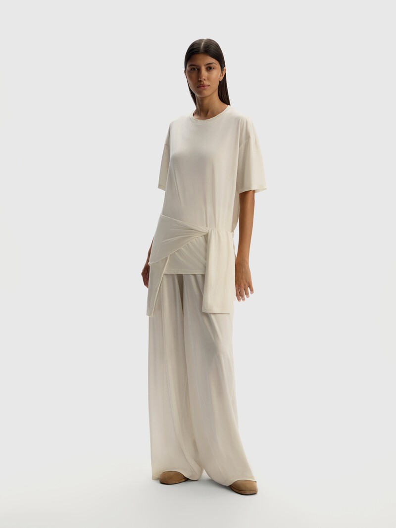 Широкие брюки со складками — находка для летних дней. Их можно стилизовать для расслабленных образов или особого случая. Струящийся трикотаж слегка холодит и деликатно поблескивает в движении. Чтобы трикотаж из натурального шелка служил вам долгие годы, храните его на полке и не гладьте утюгом. Сделано в Китае.