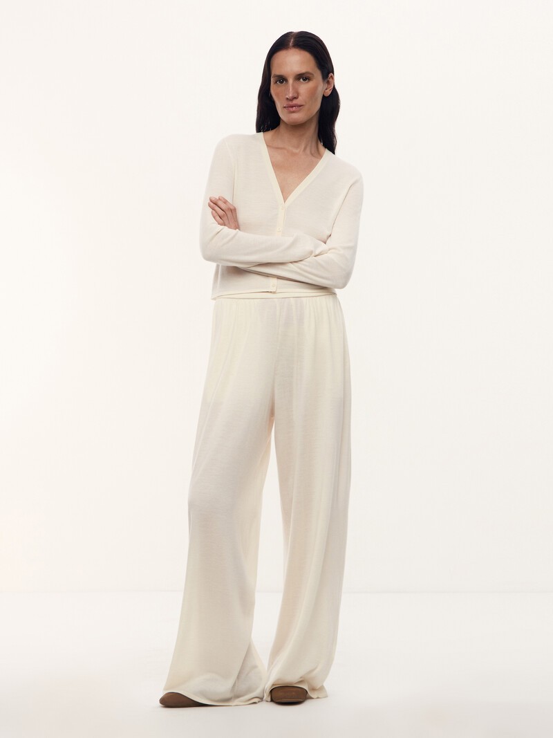 1. Связаны в одну нить из тонкой мериносовой шерсти и натурального шелка — мягко драпируются и деликатно поблескивают 2. Не добавляют лишний объем — пластичный трикотаж собирается в мелкие, нежные складки 3. Можно носить весь теплый сезон: весной — с пушистыми джемперами, летом — с топами