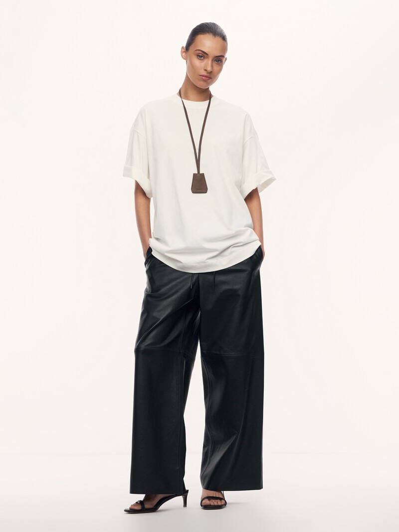 1. Для этой модели мы выбрали мягкую и пластичную кожу ягненка полурастительного дубления — она годами сохраняет природную прочность 2. Слегка укороченные, широкие — легко сочетать с обувью на плоском ходу 3. Без застежки — посадка регулируется с помощью шнурка в эластичном поясе 4. Для вашего комфорта добавили подкладку стрейч до уровня колена 5. Поставщик, с которым мы сотрудничаем, имеет наивысшую оценку организации по защите окружающей среды LWG — золотой сертификат. Это значит, что фабрика полностью соответствует требованиям экологической безопасности, имеет все необходимые очистные сооружения и заботится о здоровье сотрудников
