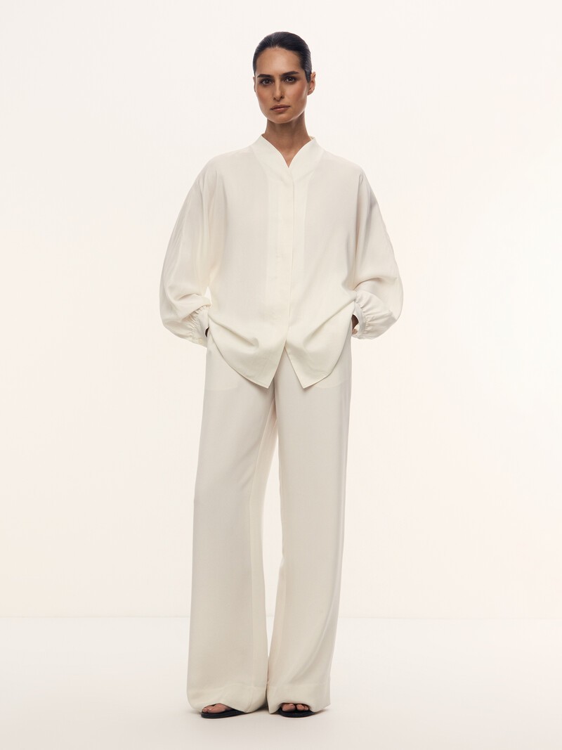 1. 100% шелк Mulberry плотностью 30 момми. С помощью особой обработки эту ткань сделали мягче обычного шелка, она не блестит и не скользит по коже 2. Эластичный пояс можно отрегулировать по фигуре с помощью внутреннего шнурка 3. Удобные карманы и длина в пол — вы можете носить брюки с босоножками на каблуке или создавать расслабленные образы с обувью на плоском ходу