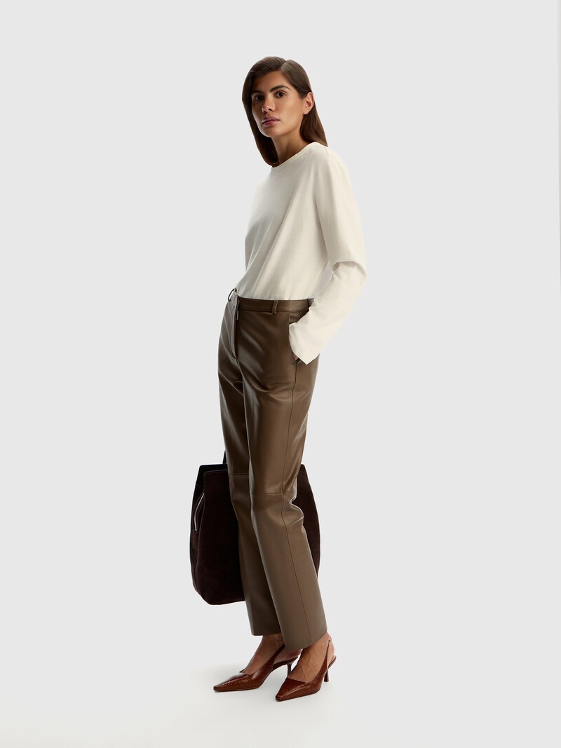 Лаконичные прямые брюки будут уместны как в вечернем образе — с шелковым топом или кашемировым джемпером, так и в более сдержанном варианте со свободным жакетом. Для модели использовали отборную кожу ягненка — пластичную и мягкую, способную сохранять свои качества десятилетиями. Частично на подкладке. При выборе размера убедитесь, что брюки сидят свободно — это важно, чтобы они служили вам как можно дольше. Золотой статус LWG означает, что фабрика полностью отвечает требованиям к экологической безопасности процессов и химикатов, имеет все необходимые очистные сооружения и заботится о здоровье сотрудников. Сделано в Турции.