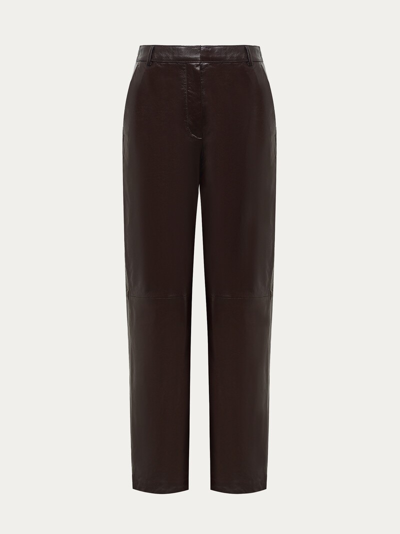 Брюки со стрелками из лакированной кожи — прямой силуэт, комфортная средняя посадка, удобные карманы. Выполнены из натуральной овечьей кожи, мягкой и эластичной. Лаковое покрытие не только придает брюкам глянцевый блеск, но и защищает кожу от влаги и загрязнений. Застегиваются на молнию Riri от нашего швейцарского поставщика — долговечную и с мягким ходом. При выборе размера убедитесь, что брюки сидят свободно — так они прослужат вам намного дольше. Золотой статус LWG означает, что фабрика полностью отвечает требованиям к экологической безопасности процессов и химикатов, имеет все необходимые очистные сооружения и заботится о здоровье сотрудников. Сделано в Турции.