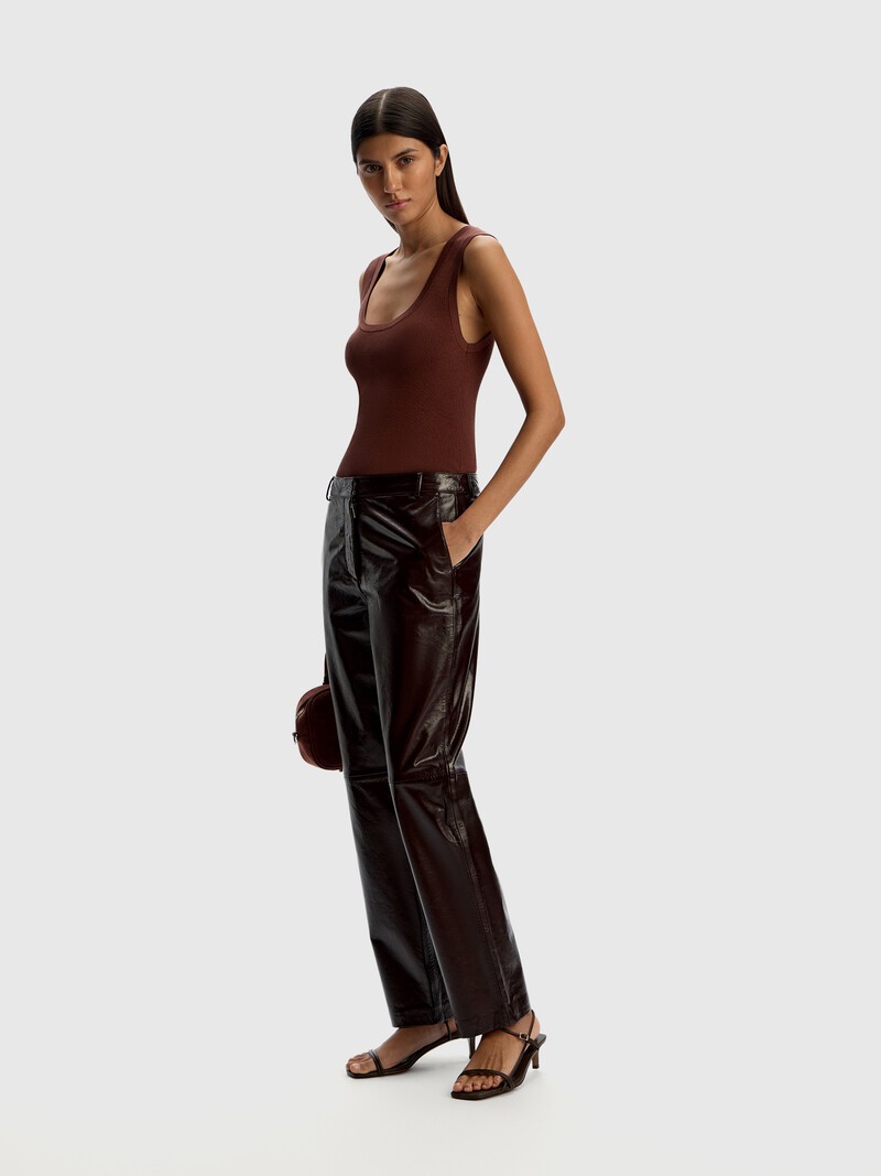 Прямые брюки со стрелками из мягкой и эластичной лакированной кожи. Глубокий, акцентный винный оттенок и комфортная средняя посадка позволяют вписать их к любой гардероб — от базового до вечернего. А лаковое покрытие придает материалу заметный глянцевый блеск и защищает от грязи и влаги. Застегиваются на молнию Riri от нашего швейцарского поставщика. При выборе размера убедитесь, что брюки сидят свободно — так они прослужат вам намного дольше. Золотой статус LWG означает, что фабрика полностью отвечает требованиям к экологической безопасности процессов и химикатов, имеет все необходимые очистные сооружения и заботится о здоровье сотрудников.
