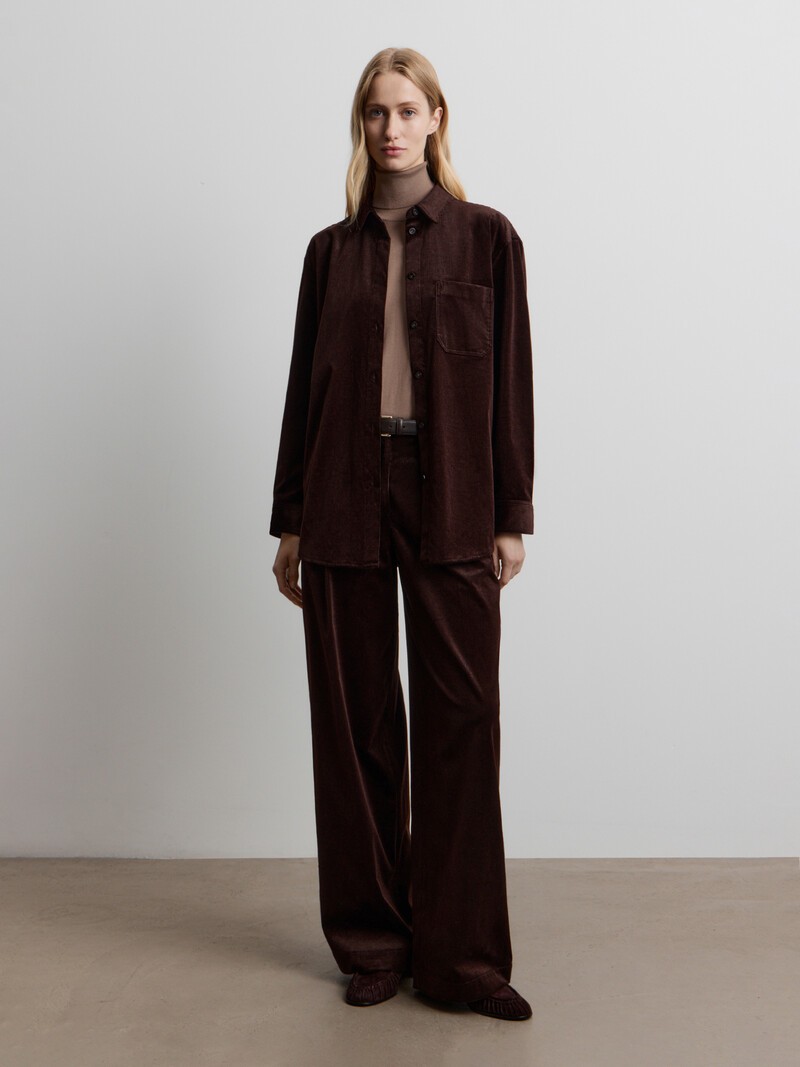 Брюки из мягкого вельвета для уютных образов в прохладную погоду. Классический силуэт — прямые и свободные, с защипами от пояса и длиной под каблук. Вельвет для них создан фабрикой, которая считается лучшим производителем бархатных материалов во Франции. Сделано в России.