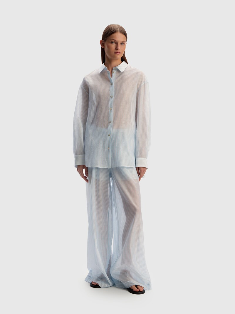Широкие летние брюки из невесомого хлопка с шелком в полоску — для многослойных образов с рубашкой и топом. Мы добавили короткие шорты из батиста, вшитые в пояс, и рассчитали длину, чтобы в движении брючина не попадала под пятку. При выборе размера убедитесь, что брюки сидят свободно — так они прослужат вам дольше.