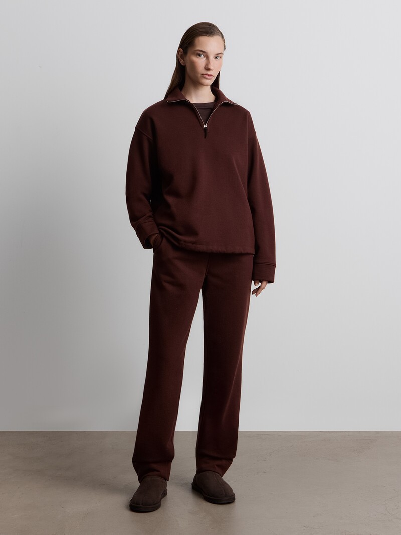 Теплые брюки из футера с добавлением шерсти — комфортные и уютные. В поясе — замшевый шнурок с металлическими наконечниками, с помощью которого можно отрегулировать посадку. Плавный О-образный силуэт и мягкие манжеты делают модель универсальной: такие брюки легко впишутся и в расслабленный образ с кедами, и в более собранный — с жакетом и каблуками. Сделано в Китае.