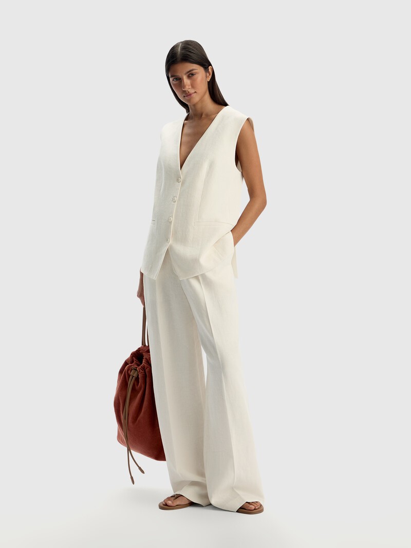 Брюки из мягкого льна и гладкой вискозы — наш летний бестселлер. Прямые, со складками и стрелками, они помогут создать комфортный и женственный образ. Ткань в нежном молочном оттенке с неоднородной фактурой пластичнее и тяжелее, чем чистый лен, а мнется гораздо меньше. Сделано в России.
